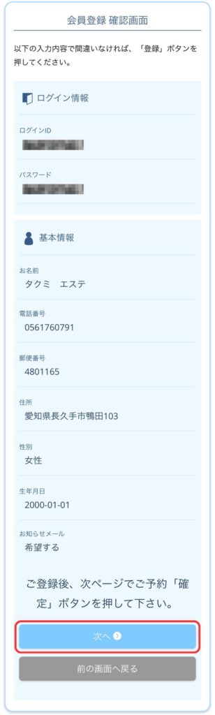 ⑧登録内容を確認し、「次へ」