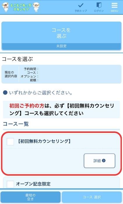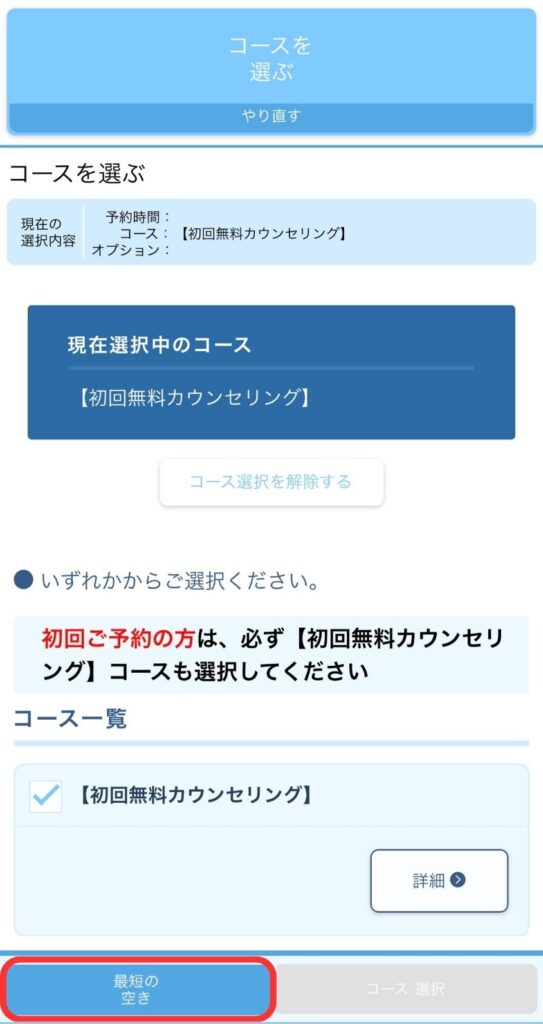 ③選択中のコースを確認し「最短の空き」を選択