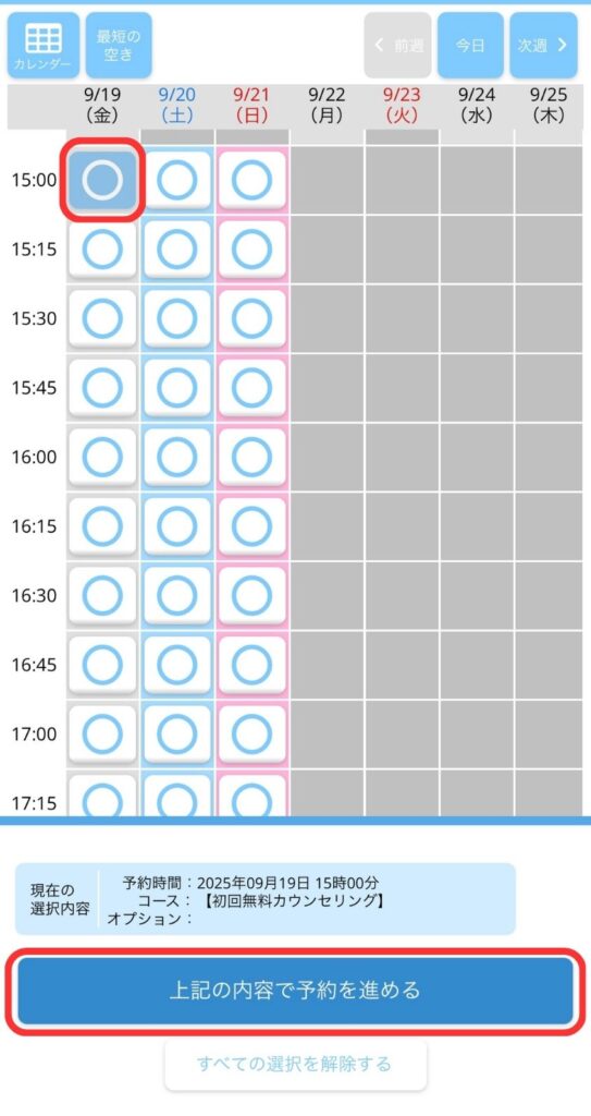 ※初回ご予約の方は、必ず初回無料カウンセリングコースも選択して下さい。